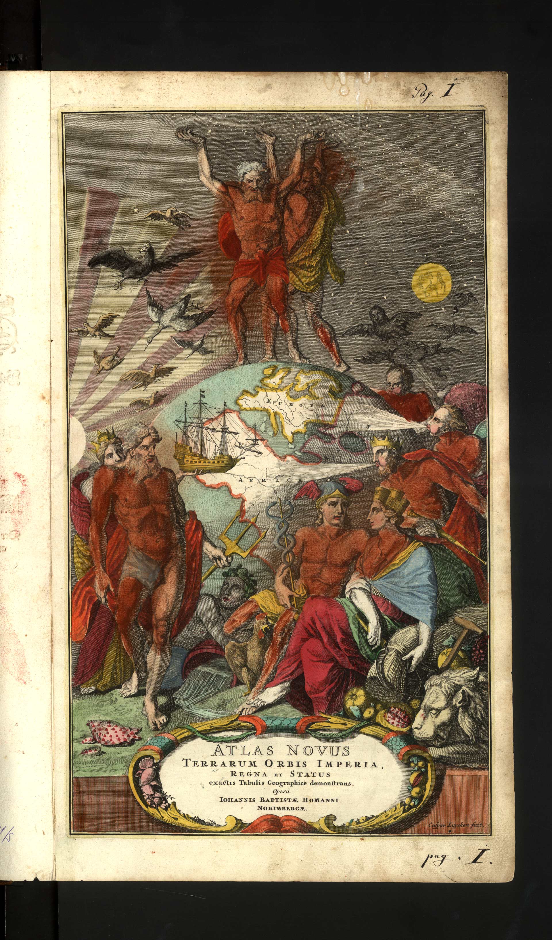 Hc-2-02) Grafický titulní list je obdobně jako i mapy obsažené v tomto atlasu proveden technikou mědirytiny a pečlivě ručně kolorován. Celkový dojem opět kazí cenzurní zásahy neznámého čtenáře, který tentokrát nahá těla alegorických figur překryl rozpitými fleky barvy hnědé.