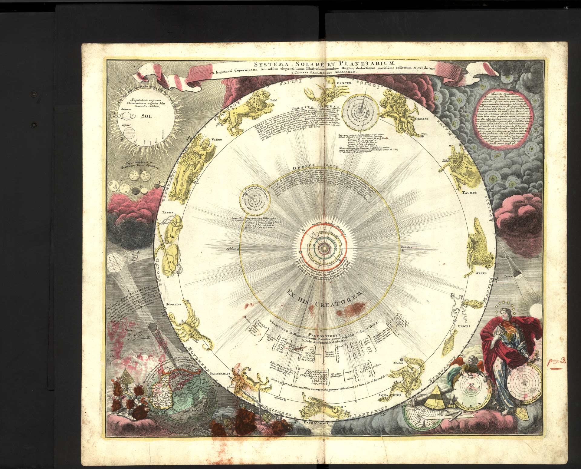 Hc-2-04) Schéma sluneční soustavy zahrnující Slunce uprostřed a jeho v té době známé oběžnice: Merkur, Venuši, Zemi, Mars a Jupiter. Schéma je obklopeno znameními zodiaku.