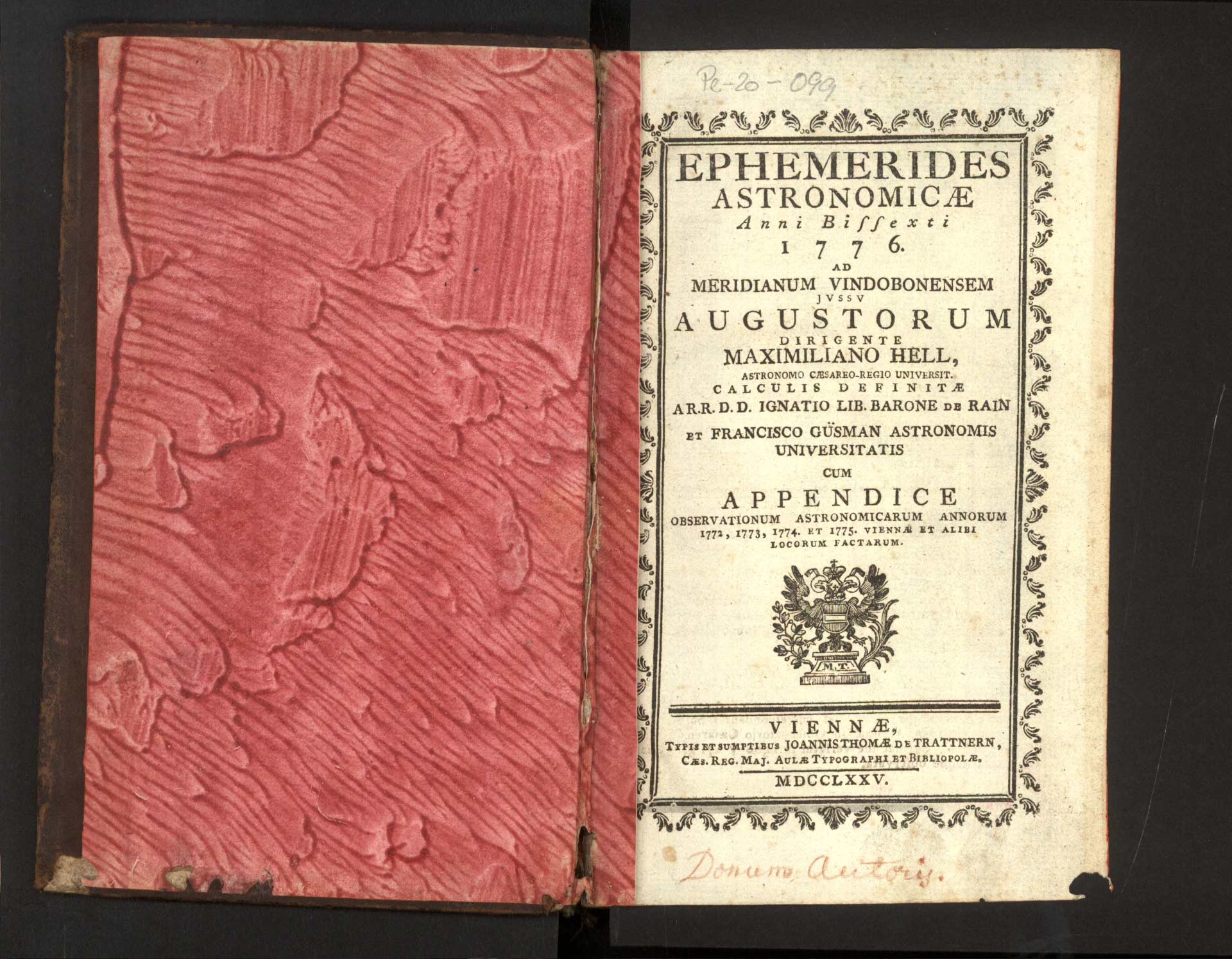 Hc-3-01) Astronomické zprávy pro rok 1776 vedené Maxmiliánem Hellem byly vydány ve Vídni předchozího roku.