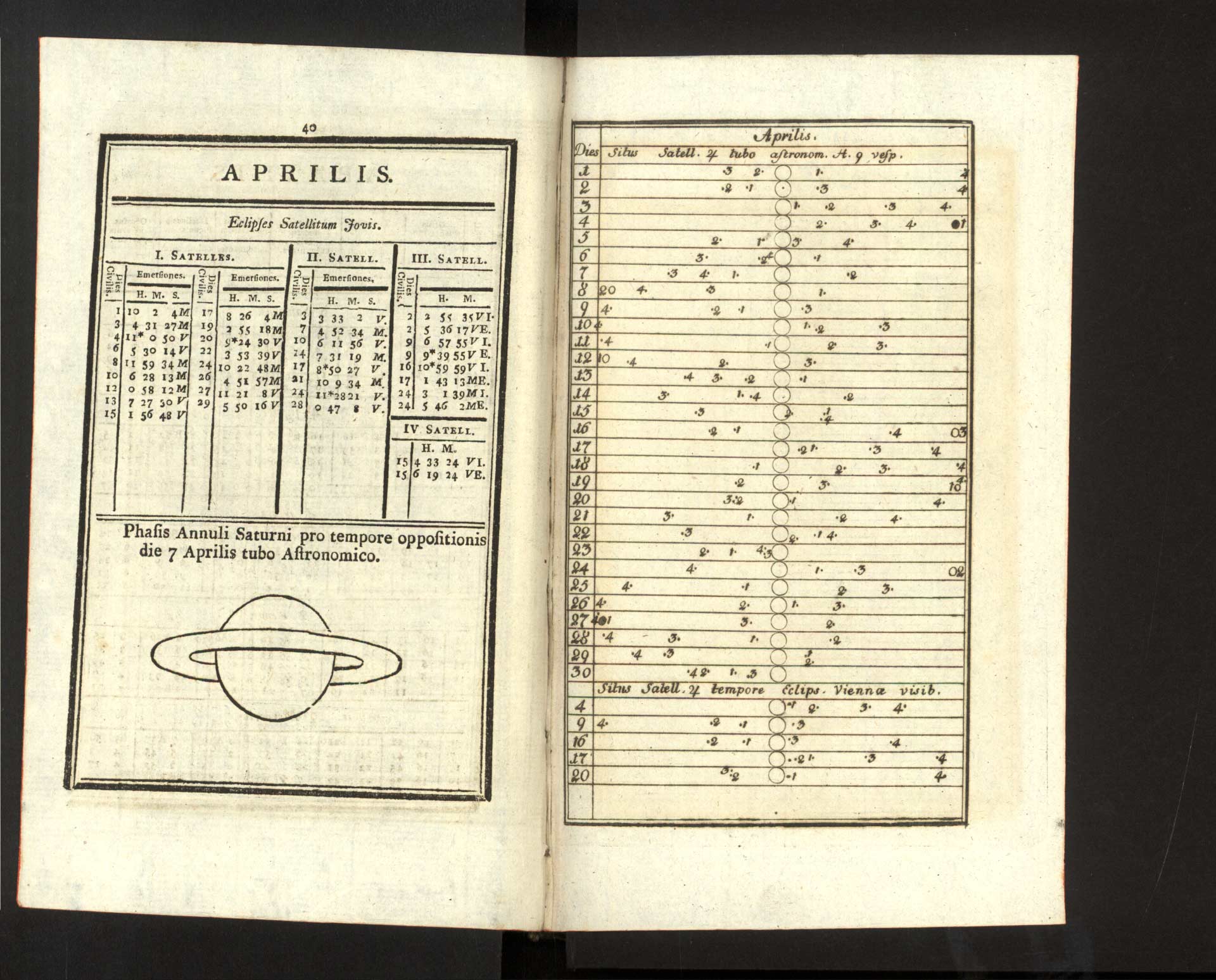 Hc-3-02) Kniha obsahuje tabulky důležité pro pozorování (v tomto případě Saturnu), a mědirytinové schéma, do nějž měla být astronomická pozorování zaznamenána.
