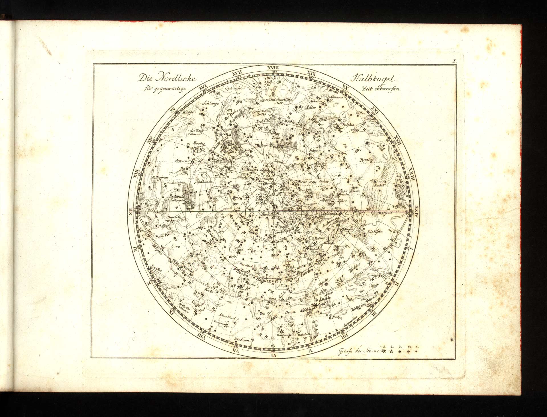 Hc-4-02) Mapa hvězdné oblohy severní polokoule. V pravém dolním rohu měřítko velikosti hvězd.