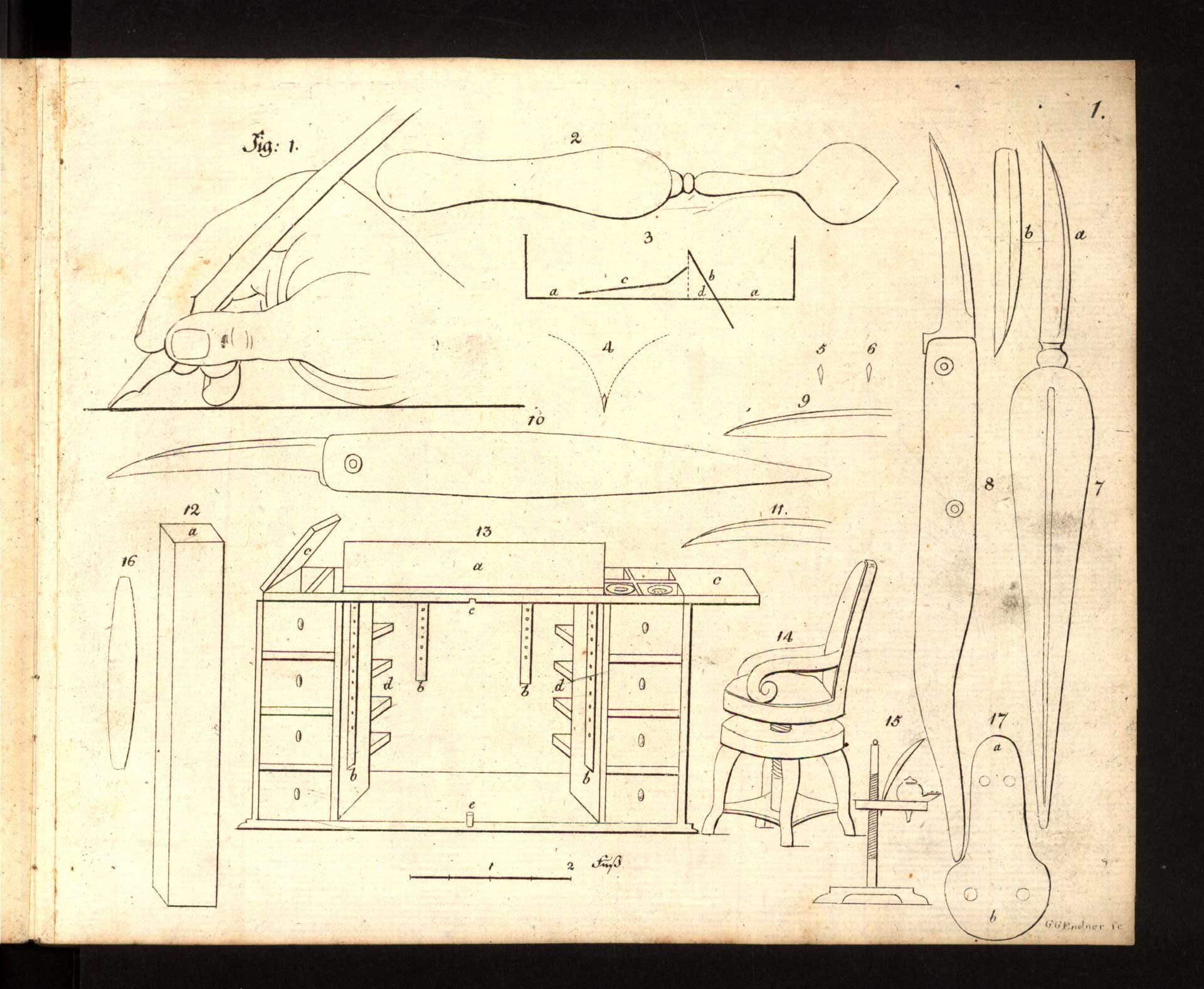 Hd-1-02) Mědirytina představující náčrt správného úchopu pera, nožů potřebných k ořezání brku, a také psacího stolu s výškově nastavitelnou židlí je dílem G. G. Endnera.
