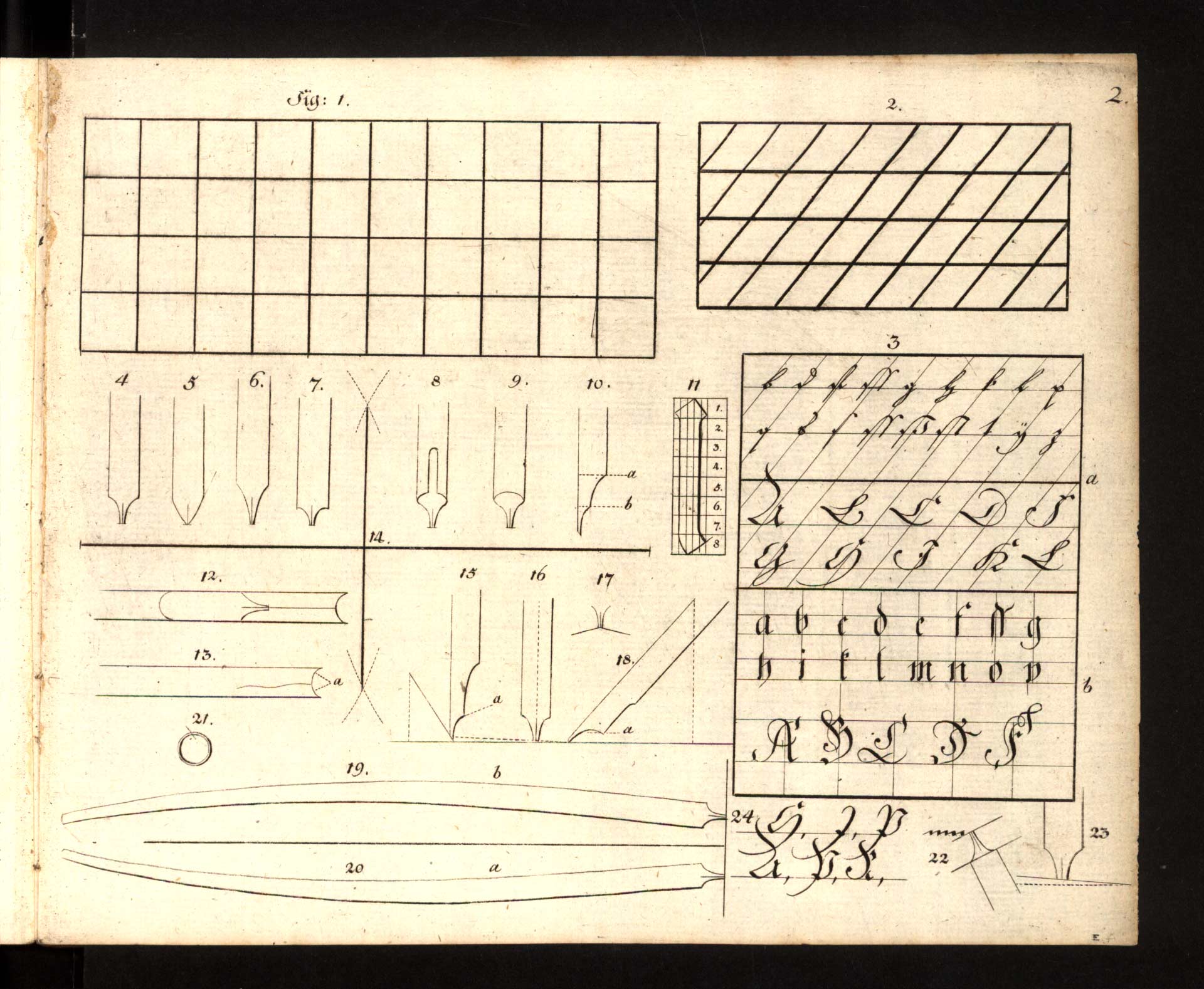 Hd-1-03) Schéma správného oříznutí husího brku a sklonu písma při psaní kurentu a fraktury.