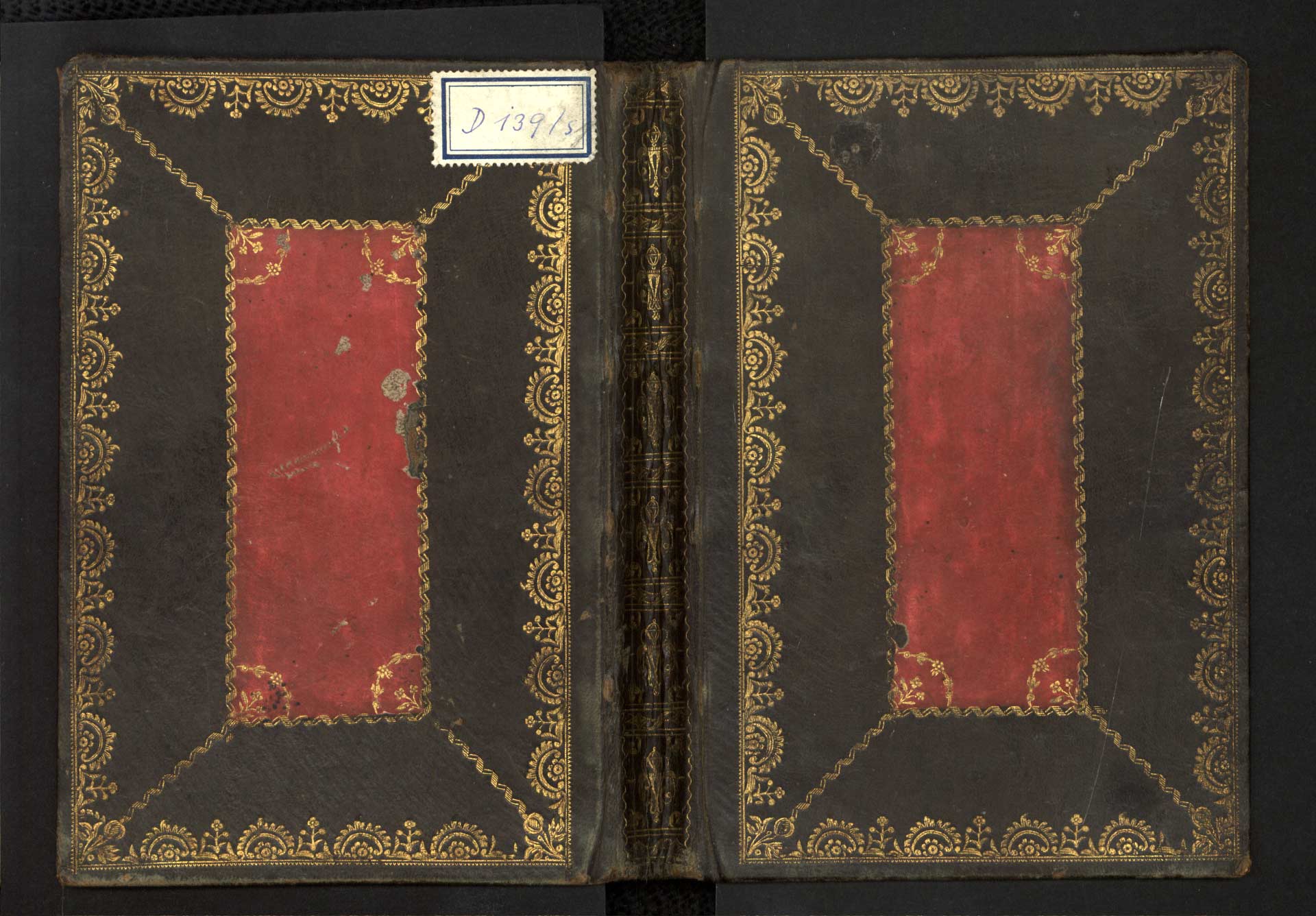 Ac-3-01) Hnědá kožená vazba zdobená zlatým tiskem ve tvaru perspektivní bordury je doplněna červeným papírovým obdélníkem.