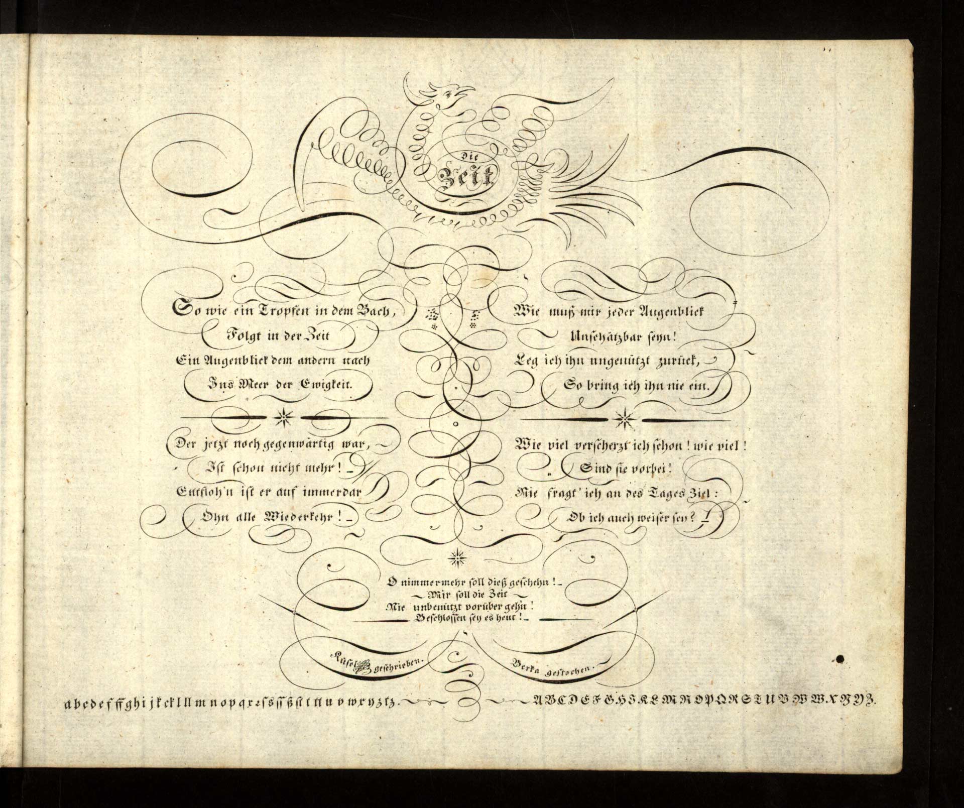 Hd-2-07) Báseň "Die Zeit" je ukázkou kaligrafického ztvárnění textu ve fraktuře. Text je doplněn informacemi o autorovi předlohy ("Küsel m. p. geschrieben") a rytci ("Berka gestochen") a malou a velkou abecedou použitého písma.