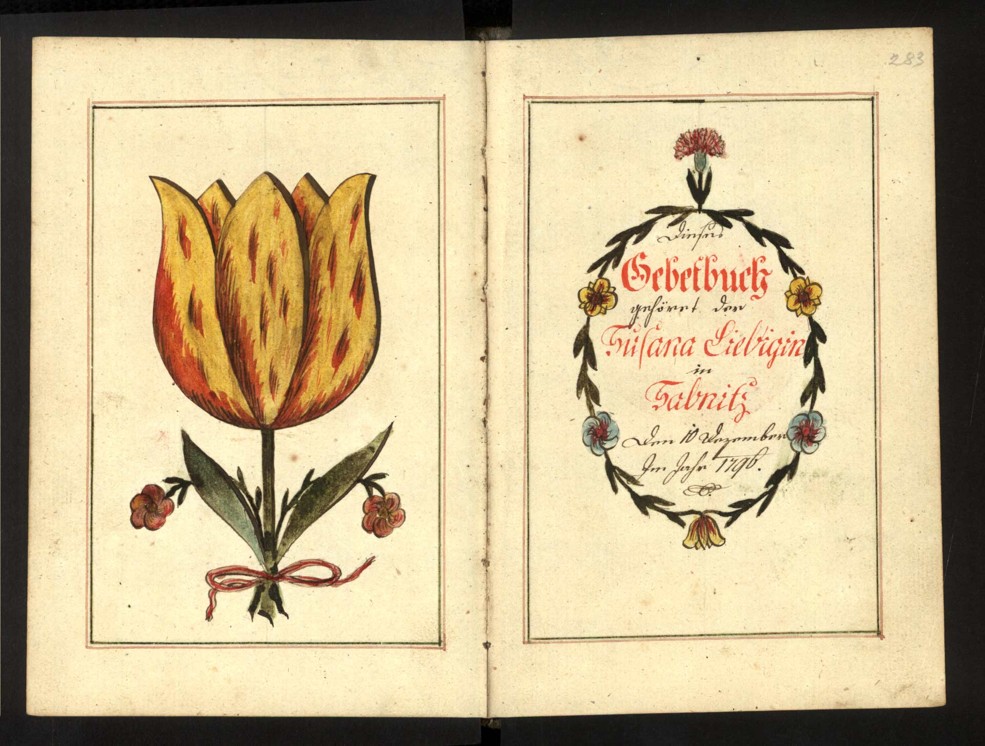 Ac-3-02) Nákladně provedená německá modlitební kniha byla dokončena 10. prosince 1796 pro Zuzanu Leibigovou z vesnice Saběnice v severních Čechách.