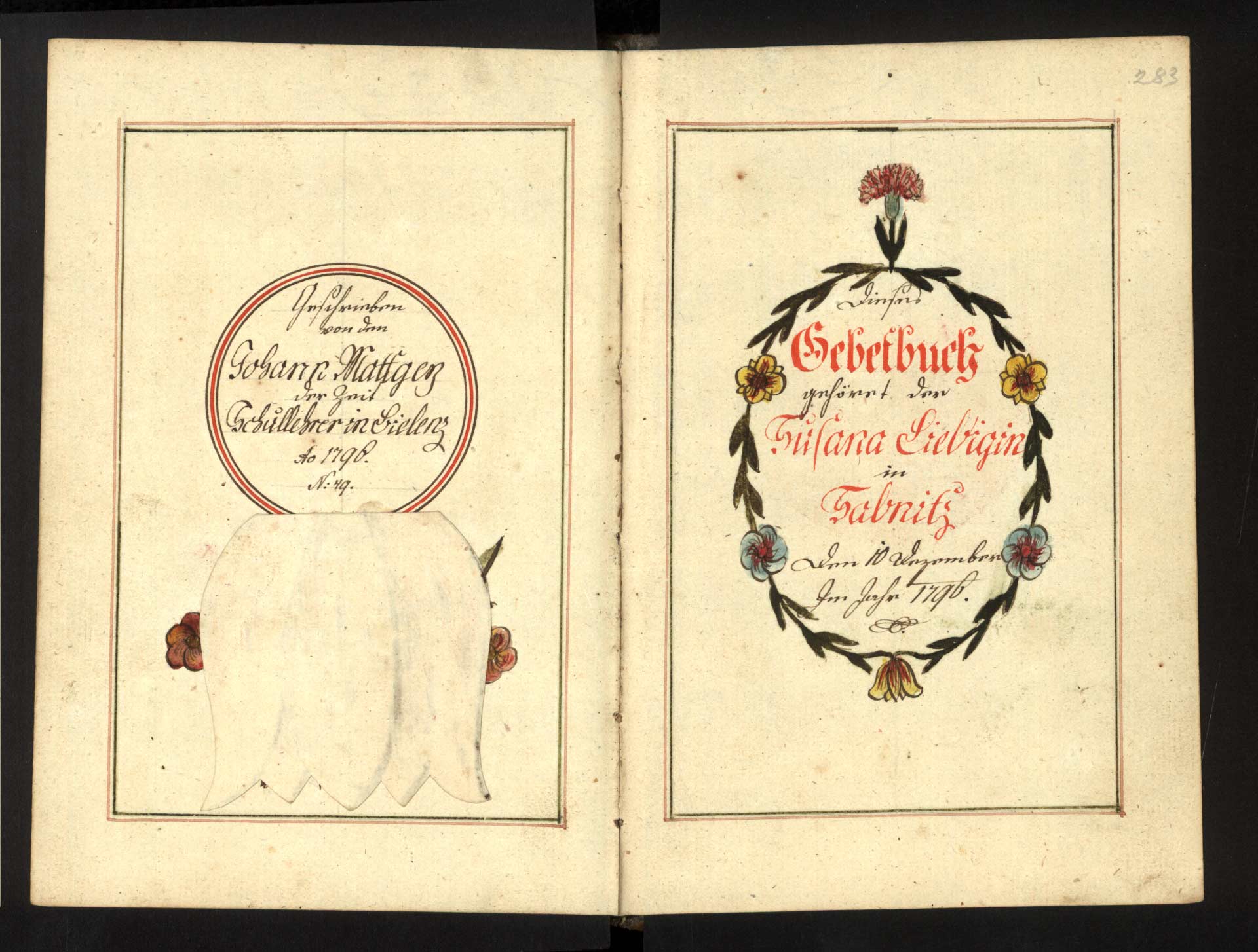 Ac-3-03) Po odkrytí namalovaného tulipánu na protější straně se dozvídáme, že písařem rukopisu byl učitel Jan Mattgecze z Bílence.