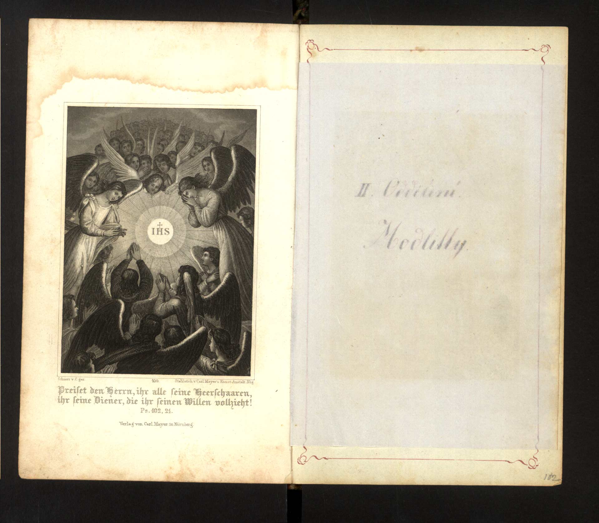 He-1-06) Část věnovaná večerním modlitbám otevírá ocelorytina andělů adorujících Nejsvětější Svátost, jejíž předlohu namaloval Schnorr.