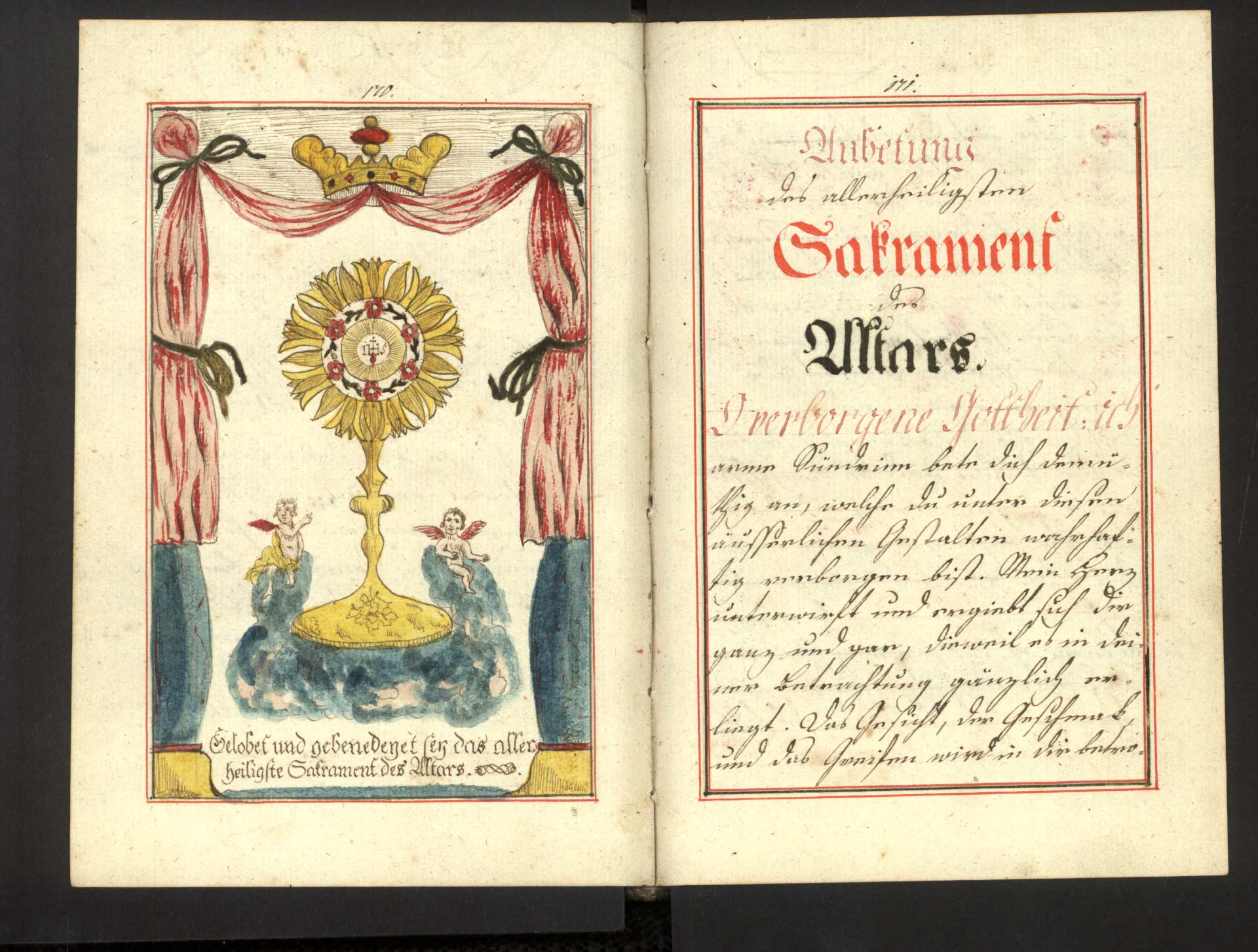 Ac-3-05) Modlitby před vystavenou Nejsvětější Svátostí oltářní jsou uvozeny celostránkovou miniaturou monstrance.