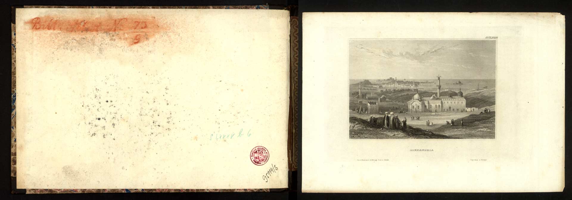 He-2-01) Album ocelorytin představujících scény ze Svaté země uvozuje nesignovaný pohled na Alexandrii.