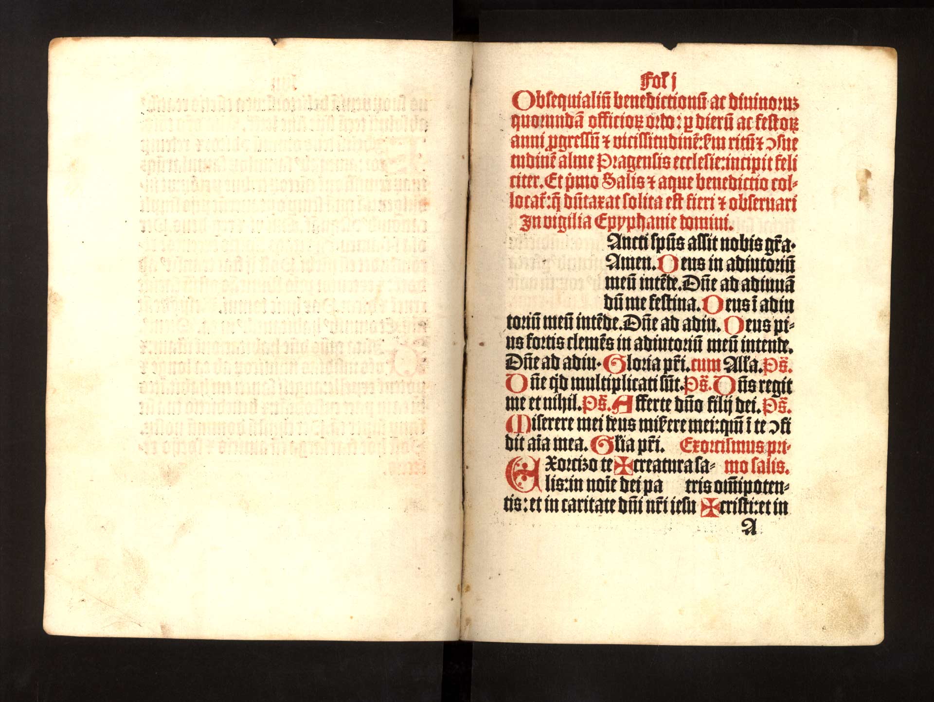 Ja-1-03) Vlastní text benedikcionálu je uvozen žehnáním soli a vody v předvečer svátku Tří králů. Prázdné místo na začátku černého textu bylo určeno pro domalování iniciály, která však doplněna nebyla.