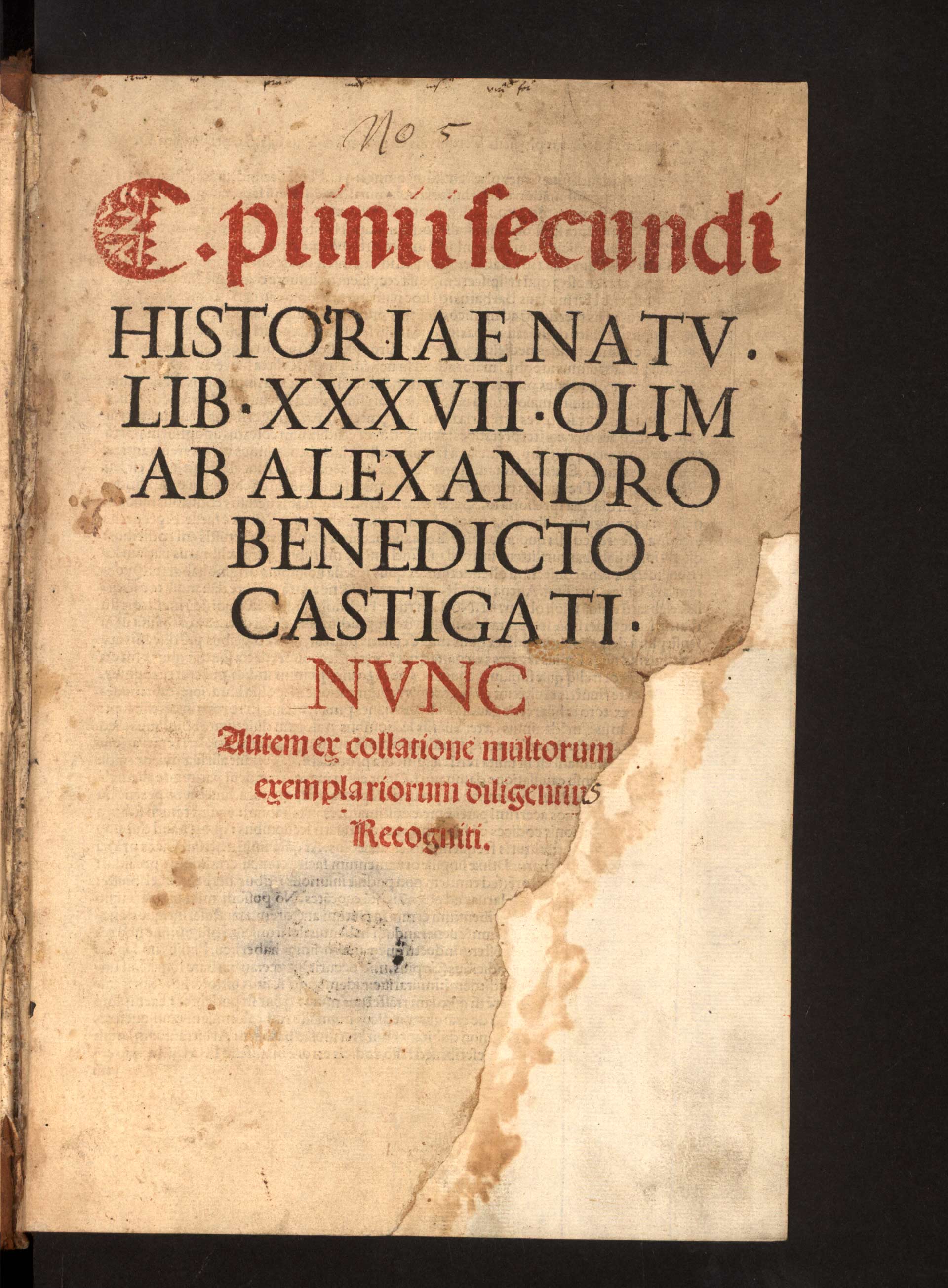 Ja-4-01) Titulní list slavného Přírodopisu ("Naturalis historia"), sepsaného Gaiem Pliniem Starším a vydaného roku 1516 v Benátkách. Informace o tiskaři přináší až předposlední list.