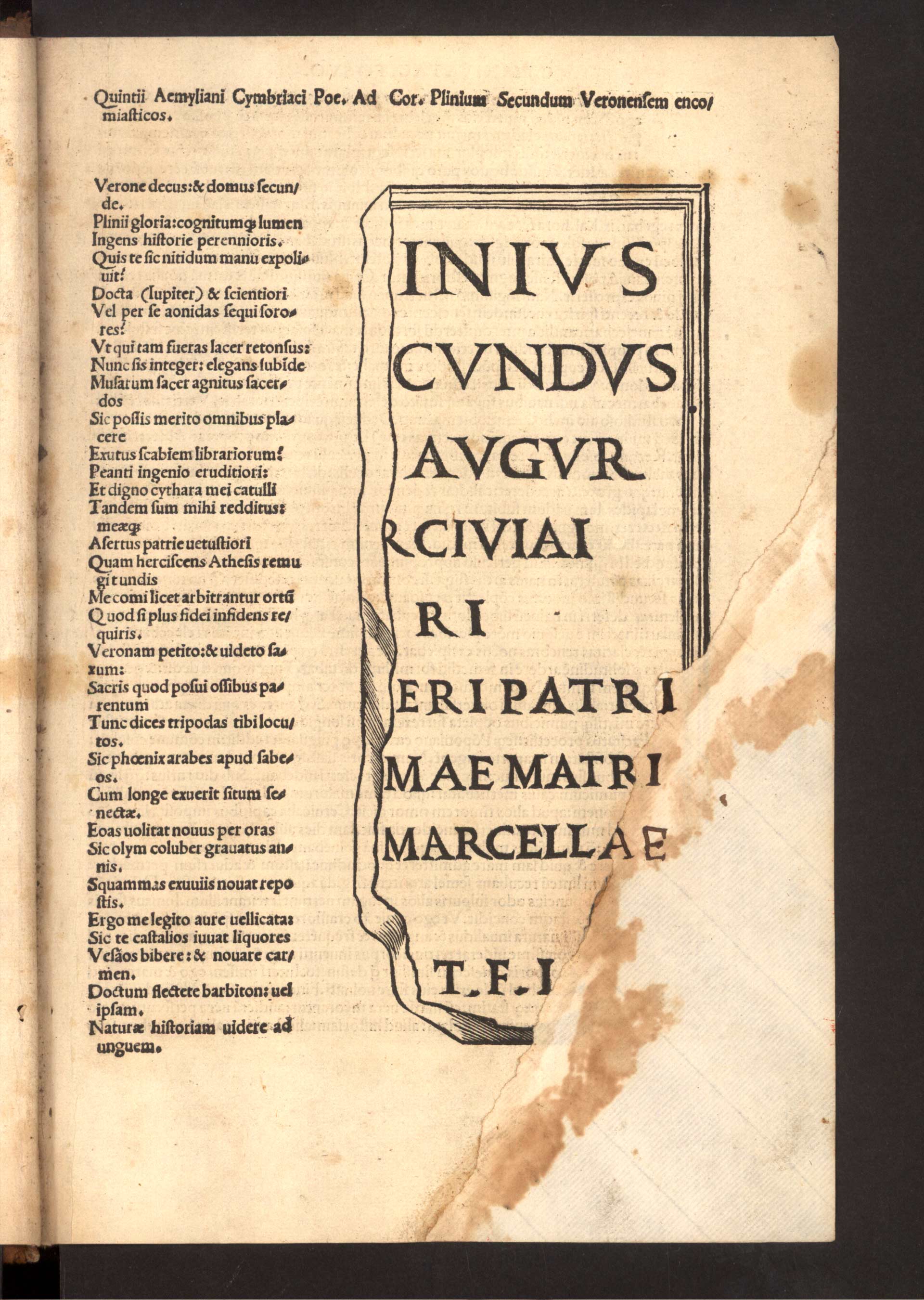 Ja-4-02) Na začátku díla je dřevořez zachycující zlomek nápisové desky, která měla Plinia připomínat.
