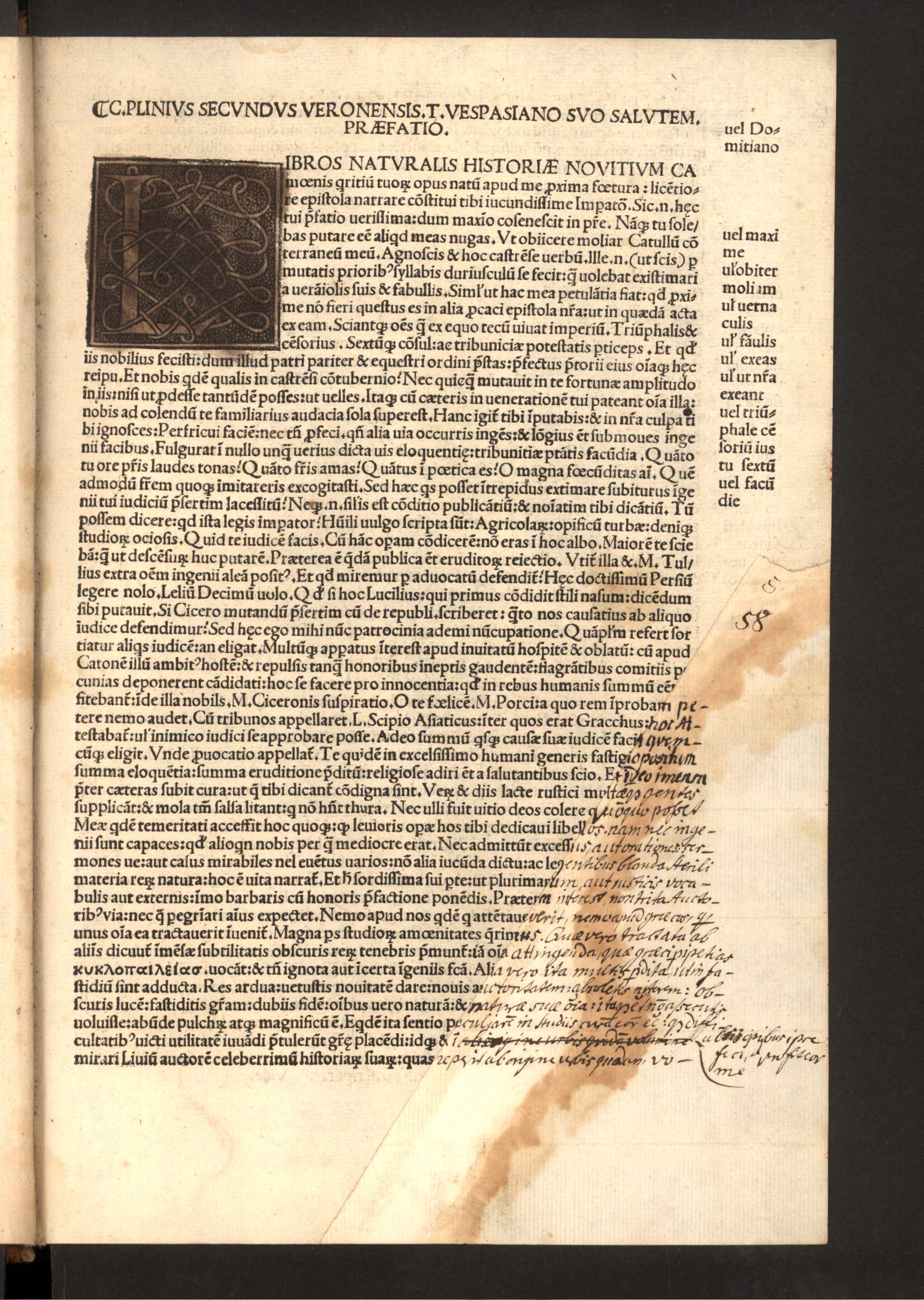 Ja-4-03) Předmluva Plinia Staršího, adresovaná císaři Vespasianovi, je uvozena iniciálou, jejíž pozadí je vytvořeno šrotovým tiskem. Iniciála byla později vybarvena hnědou barvou. Kniha byla poškozena odtržením pravého dolního rohu na více místech. Na této straně pozdější čtenář text ručně doplnil.
