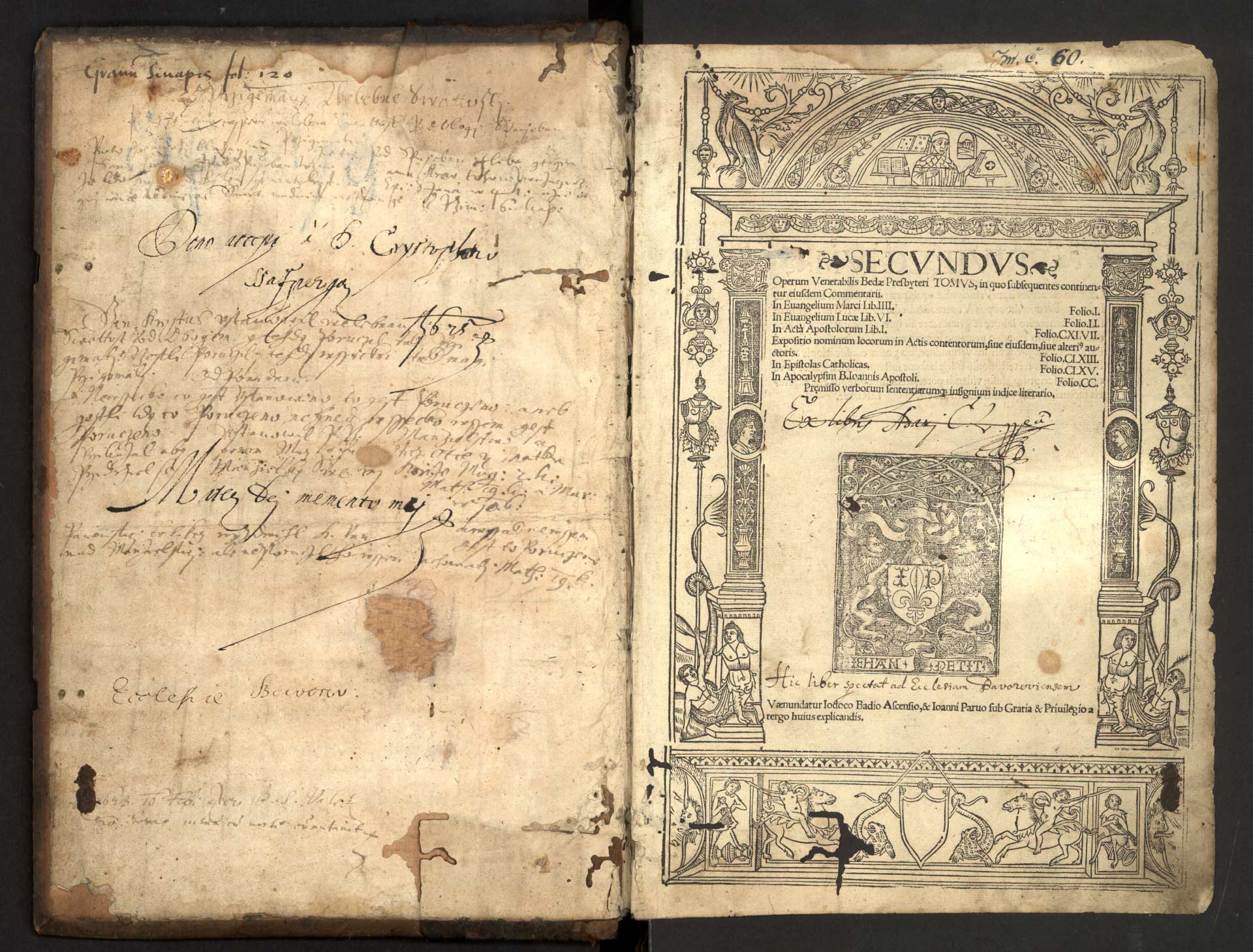 Ja-5-01) Druhý svazek sebraného díla sv. Bedy Ctihodného obsahuje komentáře k jednotlivým knihám Nového zákona. Titulní list je vložen do architektury, tvořené dřevořezy a vybaven tiskařským signetem Jeana Petita, vytvořeným technikou šrotového tisku. Rukopisné přípisky uvádějí jako vlastníka Adama C. L. a kostel v jihočeském Bavorově. Na předním přídeští kromě řady čtenářských poznámek je informace, že zde neuvedený vlastník knihu dostal od pana Kryštofa Šafperga roku 1675.