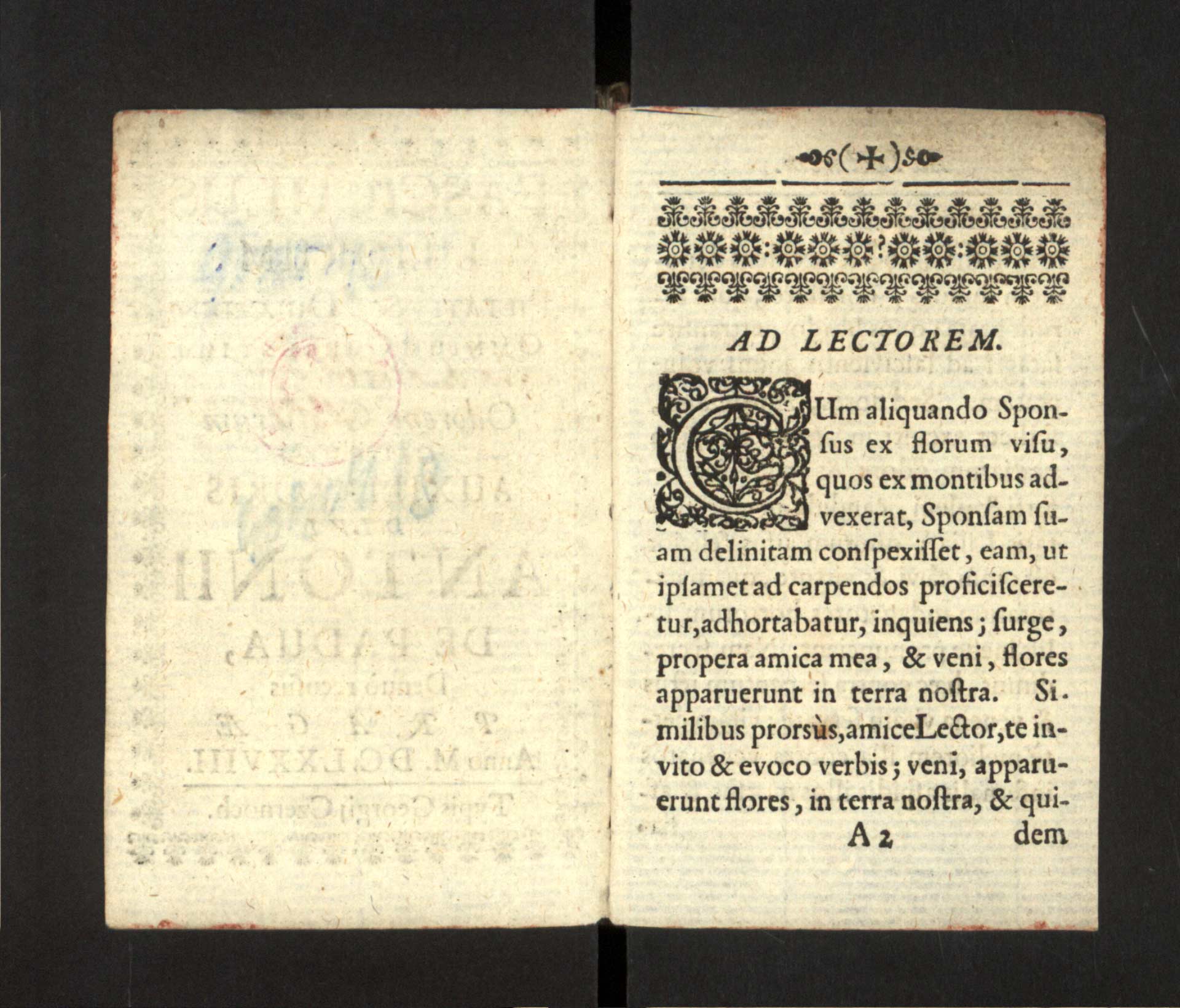 Jb-2-02) Předmluva ke čtenáři je ozdobena vlysem z tiskařských ozdůbek a iniciálou provedenou technikou dřevořezu.
