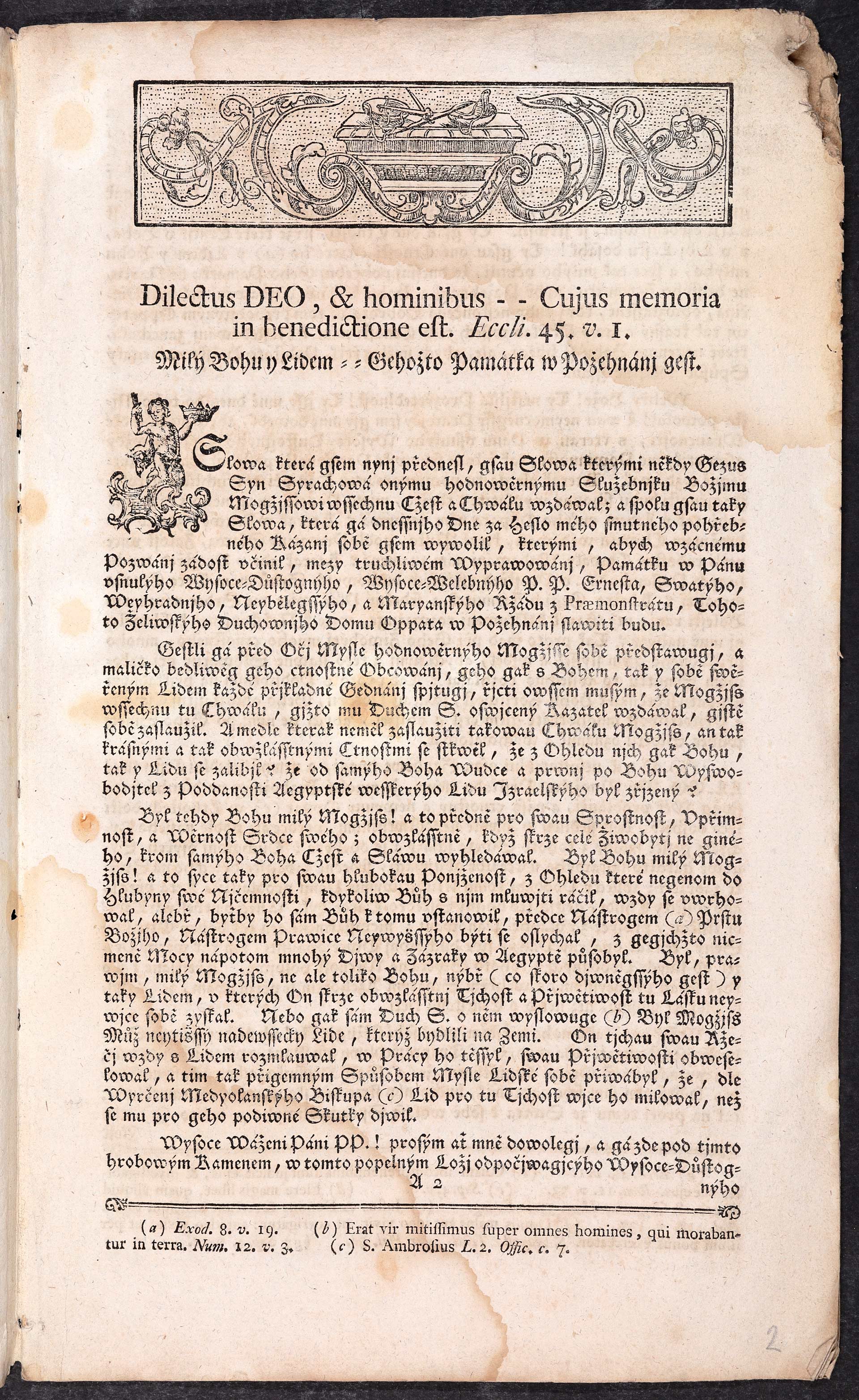Jb-3-02) První strana kázání, uvozená dřevořezovým vlysem a drobným dřevořezem provázejícím iniciálku.