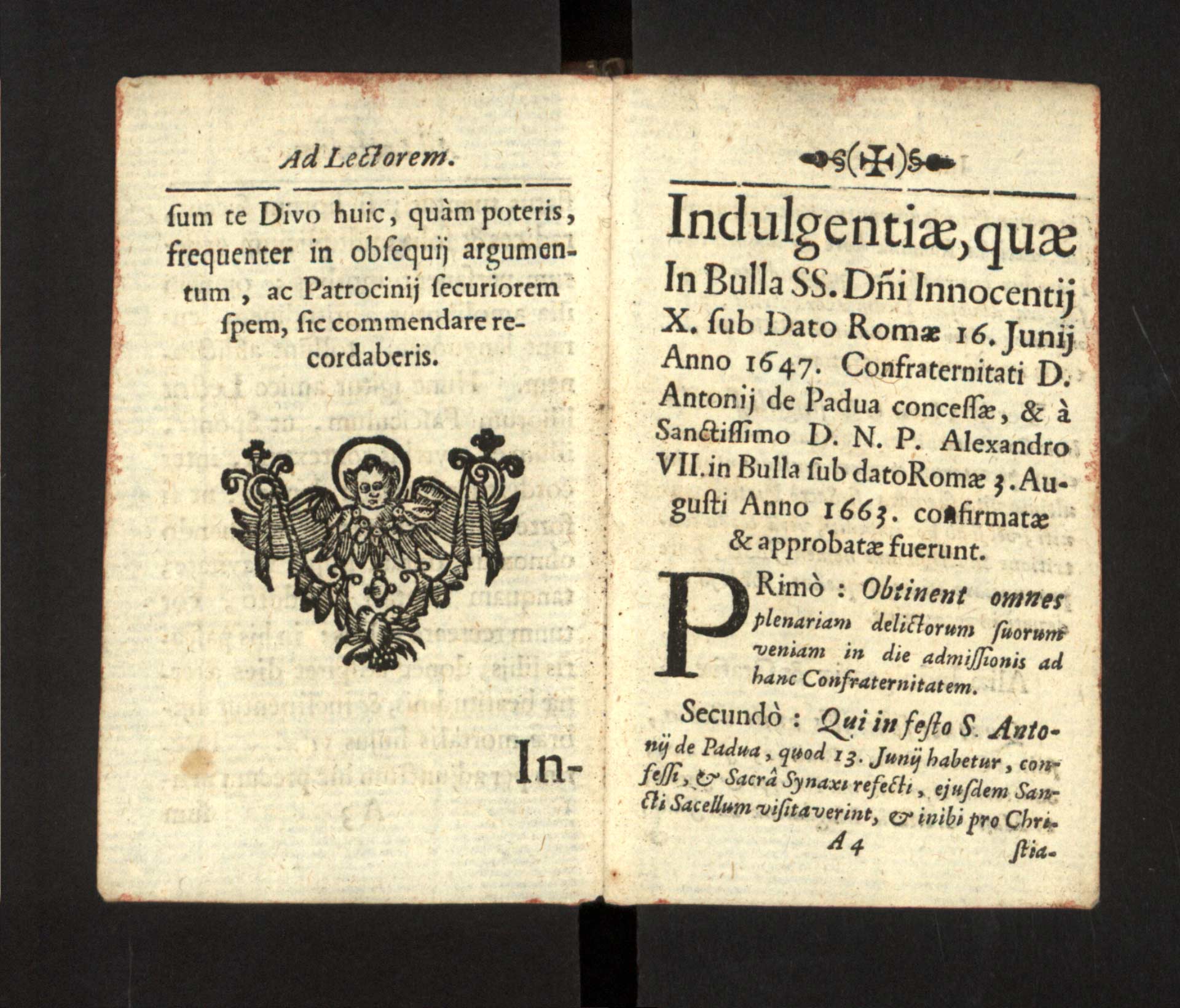 Jb-2-03) Zbytek volné strany na konci předmluvy je vyplněn dřevořezovou vinětou, slabika "in-" pod ní zajišťuje návaznost na další text - jedná se o stránkovou kustodu. Na pravé straně začíná popis odpustků, svázaných s úctou k sv. Antonínu Paduánskému, zde použité velké písmeno "P" bývá označováno jako versálka. Na stránce dole kromě kustody nalezneme i signaturu tiskového archu ("A 4").