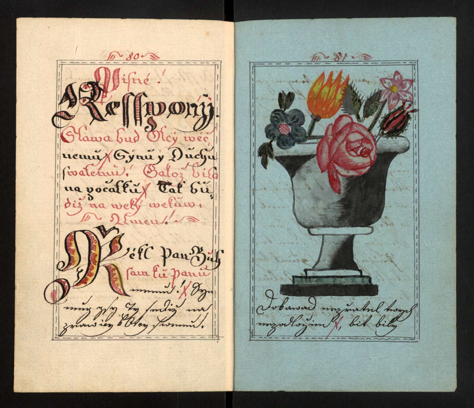 Ac-4-05) Text je vyzdoben řadou kolorovaných a lavírovaných kreseb: váza s květinami doprovází písně používané při modlitbě nešpor.