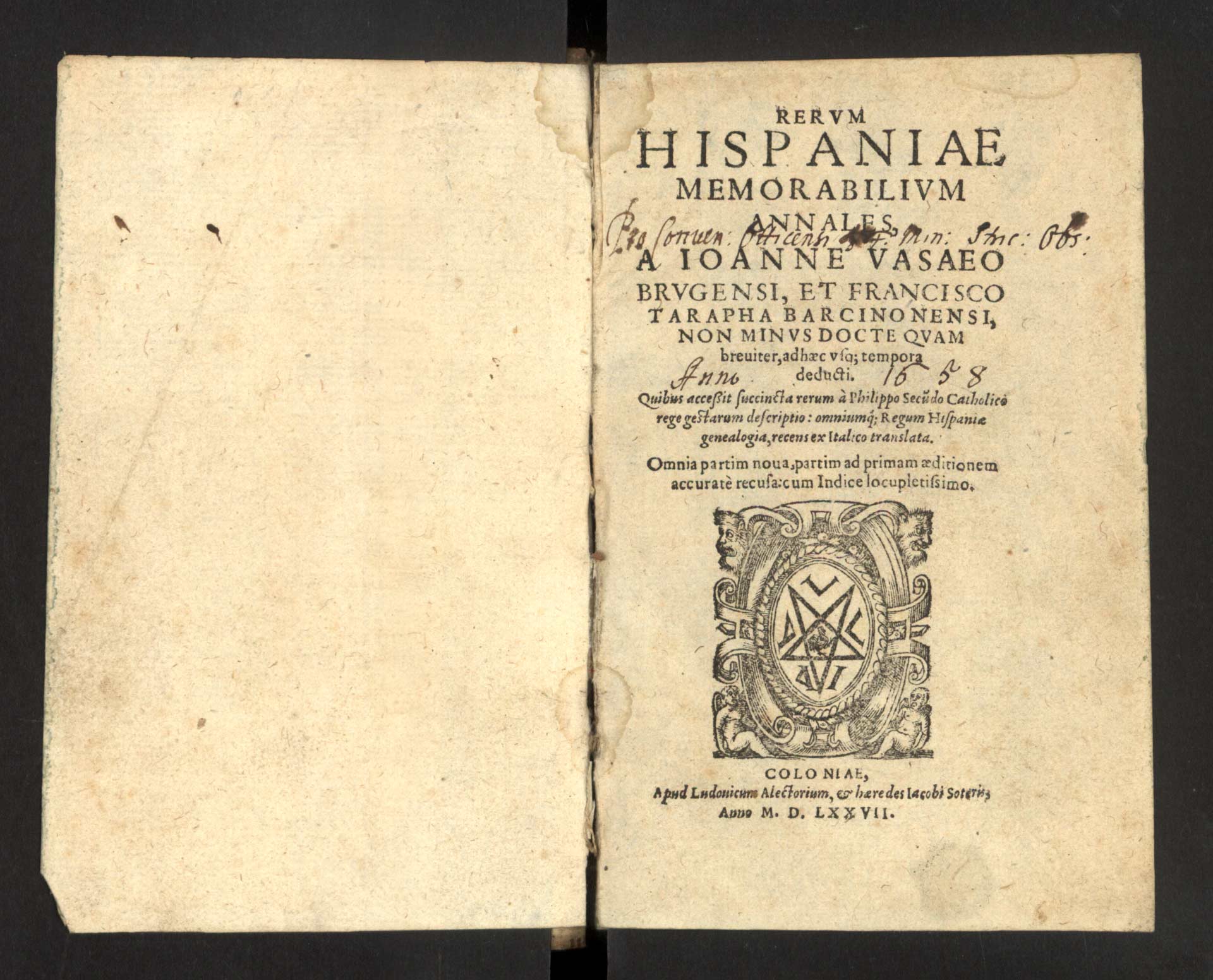 Ba-2-02) Titulní list knihy prozrazuje, že se jedná o historii Španělska od Jana Waessae (1511-1561), vydanou v Kolíně nad Rýnem 1577. Na titulním listu je také záznam o získání svazku konventem františkánů ve Voticích roku 1658.