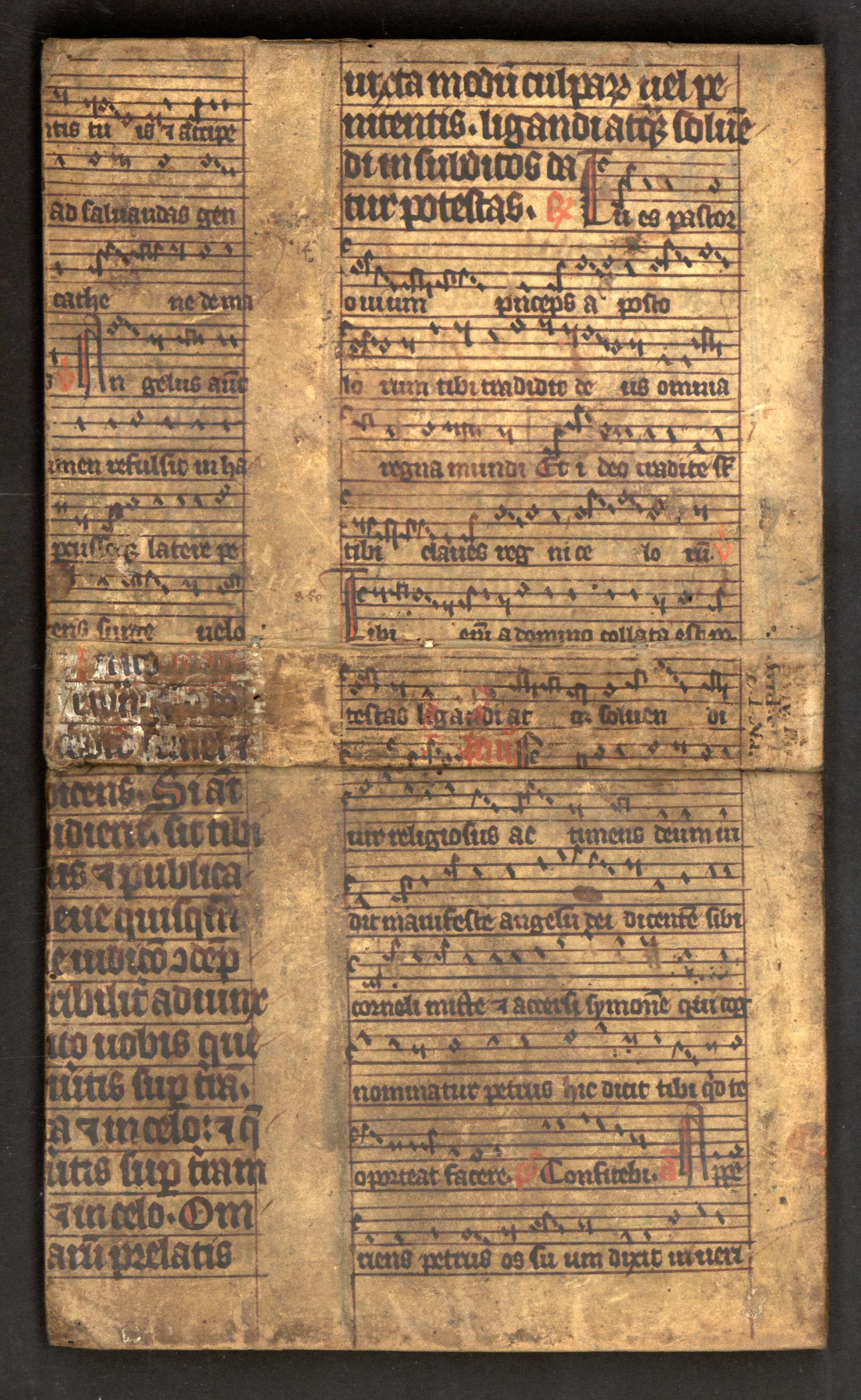 Ba-4-01) Vazba ze sekundárně použitého pergamenu obsahuje text psaný gotickou minuskulou doprovázený archaickou formou chorální notace.