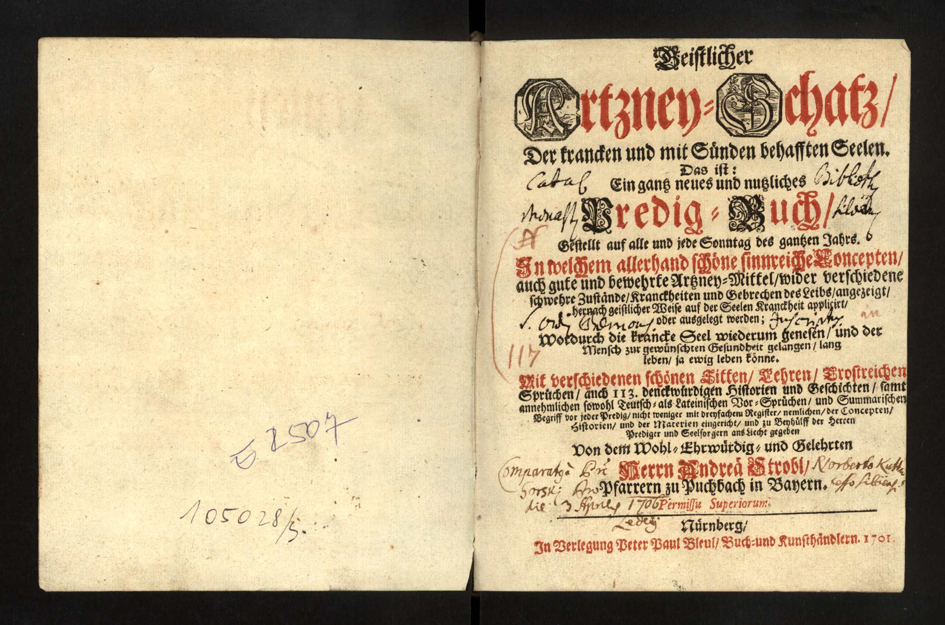 Ba-3-02) Titulní list prozrazuje, že kniha německých kázání ("Geistlicher Artznei-Schatz") od Ondřeje Strobla byla vydaná v Norimberku v roce 1701. O pět let později byla zakoupena v Ledči nad Sázavou želivským premonstátem Norbertem Kutnohorským a stala se součástí klášterní knihovny.