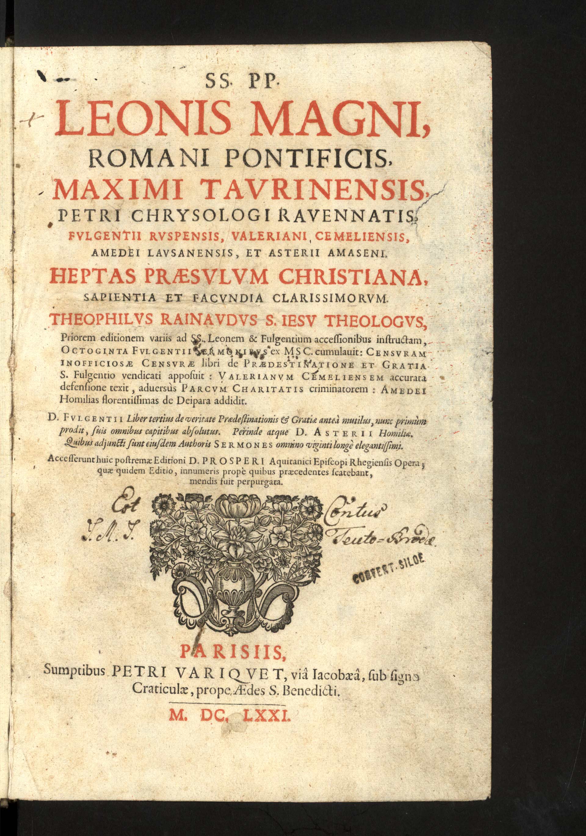 Bb-2-02) Spisy sedmi křesťanských otců včetně papeže Lva Velikého vydané v Paříži roku 1671 byly podle vlastnické poznámky majetkem kláštera bosých augustiniánů v Německém (dnes Havlíčkově) Brodě.
