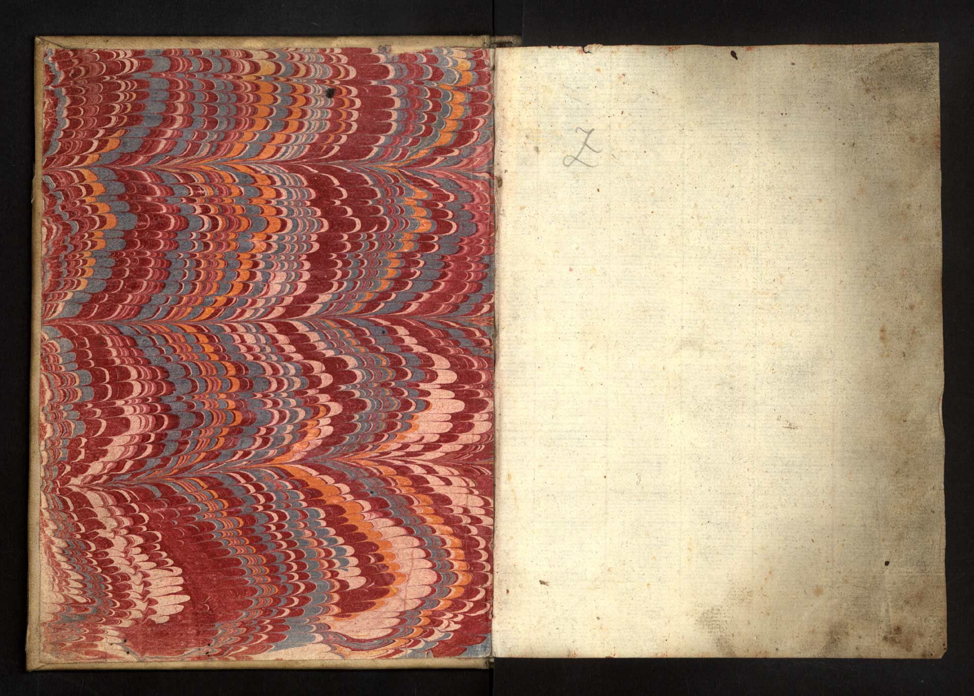 Bb-3-02) Přídeští knihy je vylepeno dobově velmi oblíbeným tureckým papírem.