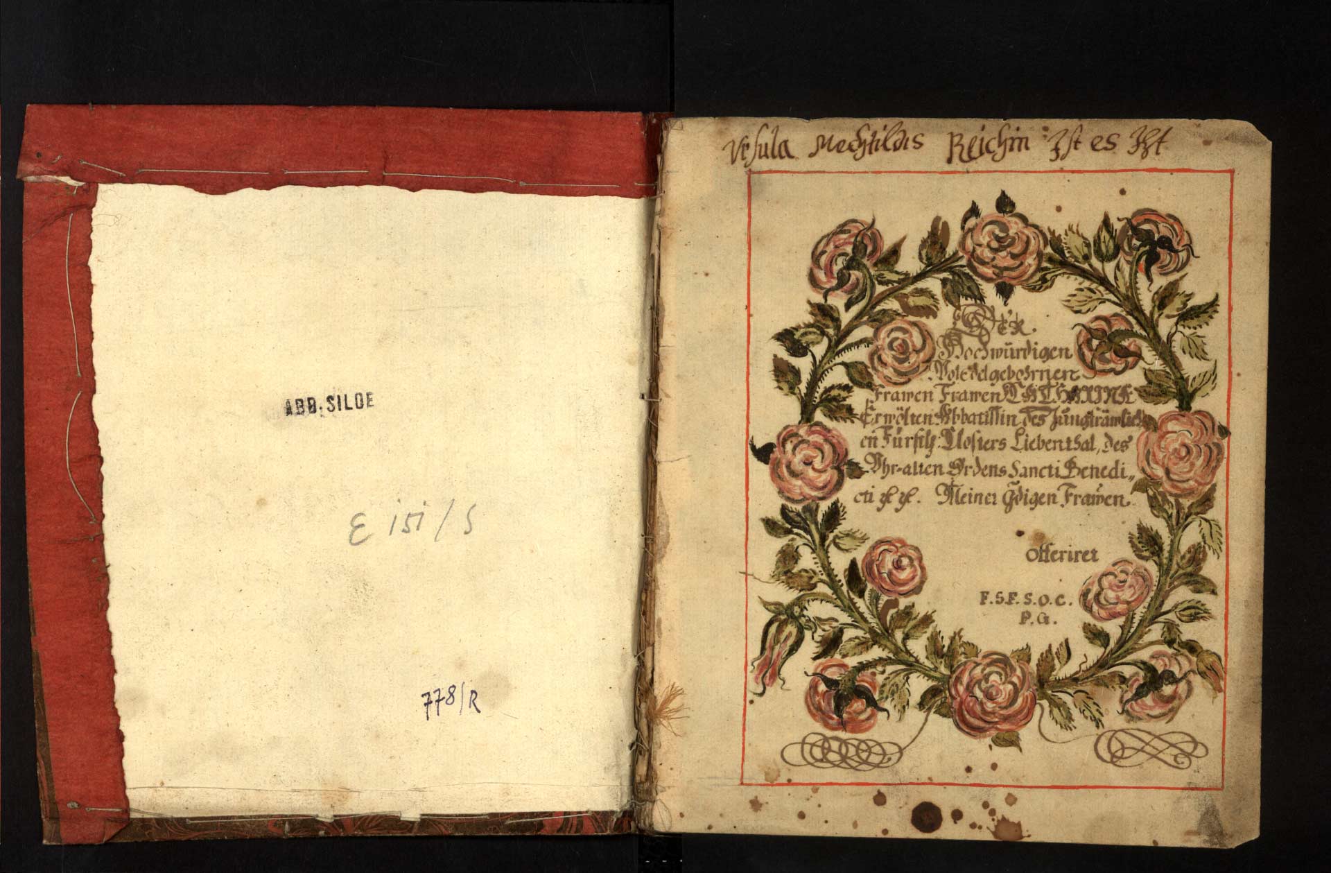 Bc-3-02) Věnování rukopisu abatyši Kateřině z kláštera benediktinek v Liebenthalu je obklopeno věncem z růží.