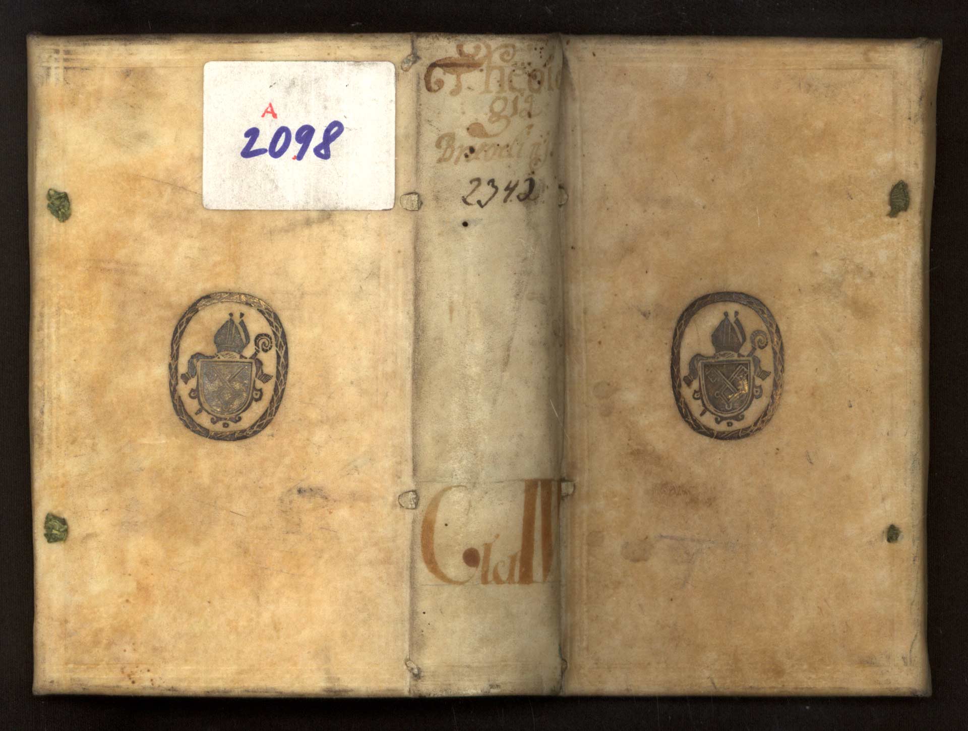 Ca-1-01) Pergamenová vazba opatřená na přední i zadní desce erbovním supralibros želivského kláštera. Použitý znak kanonie zachycuje starší verzi erbu zahrnující pouze zkřížené klíče svatého Petra. Na hřbetě knihy nalezneme pak kromě názvu i dvě nejstarší doložené signatury zdejší knihovny.
