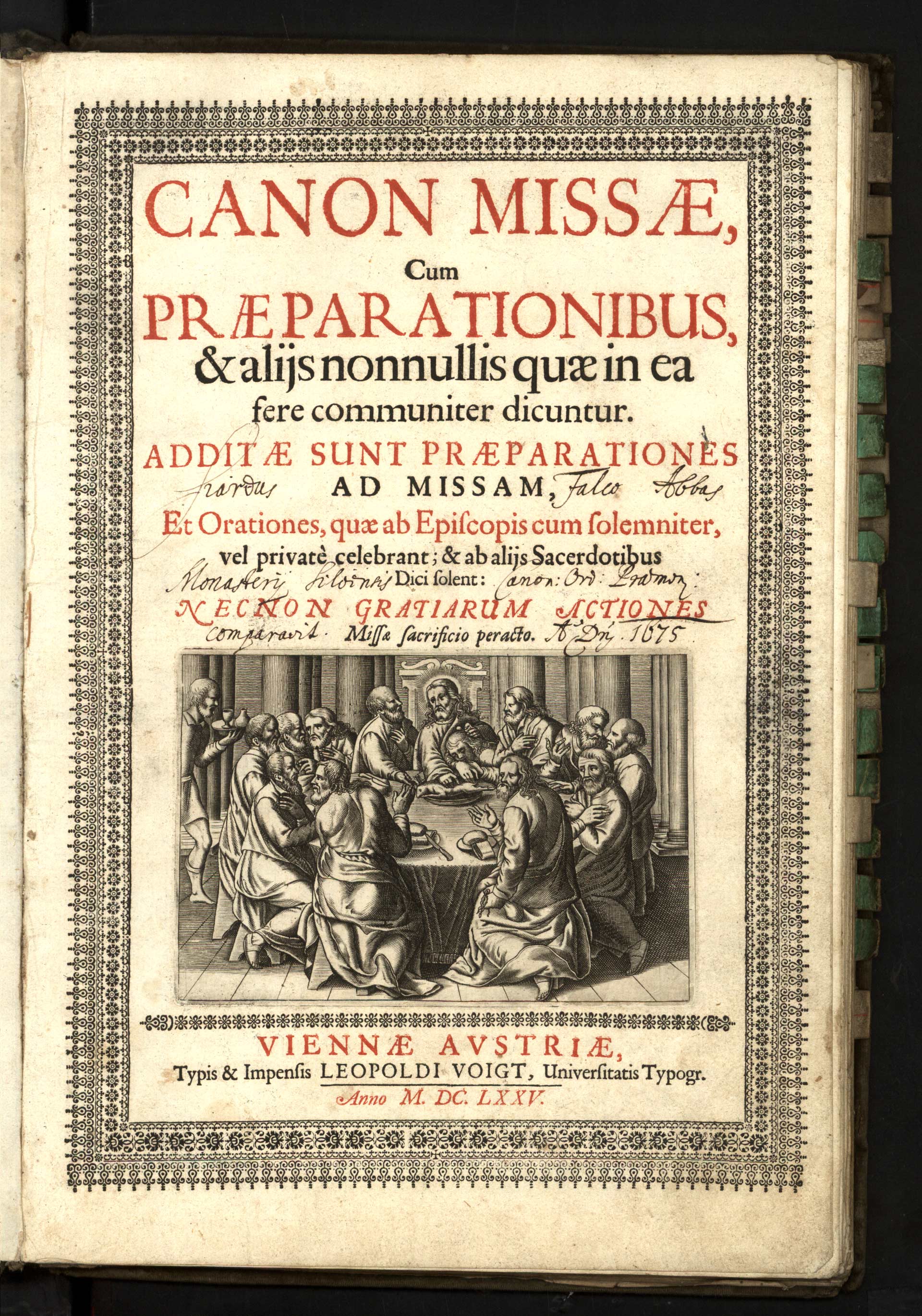 Ca-2-01) Poznámka na titulním listu mešního kánonu dokládá zakoupení knihy opatem Siardem Falkem roku 1675, tedy ve stejné době, kdy byla kniha vytištěna ve Vídni Leopoldem Voigtem. List je lemován bordurou z tiskařských ozdůbek a zdoben mědirytinou Poslední večeře.