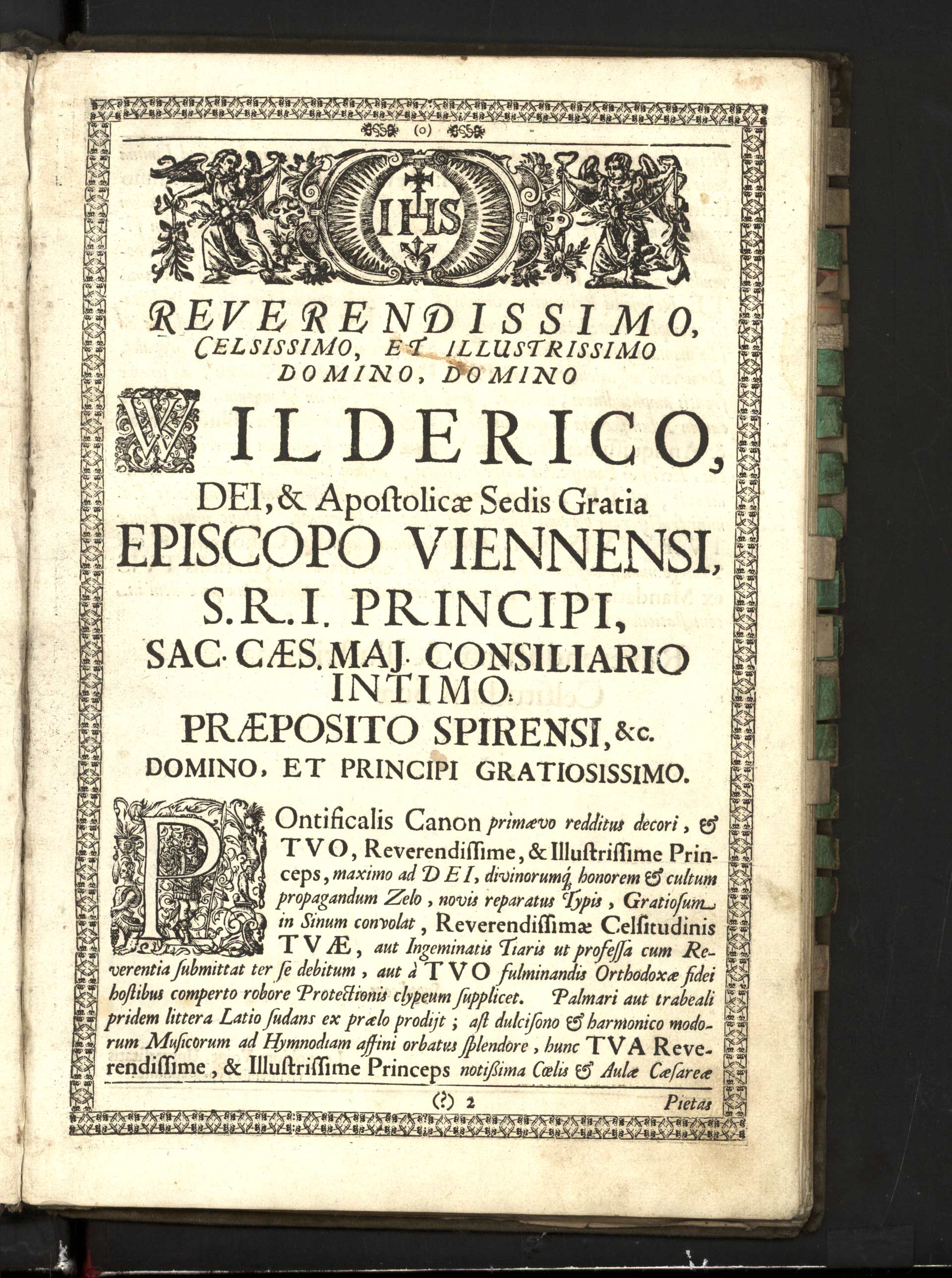 Ca-2-02) Věnování tisku vídeňskému arcibiskupovi je opět lemováno bordurou z tiskařských ozdůbek, uvozeno dřevořezovým vlysem a dvěma iniciálami.