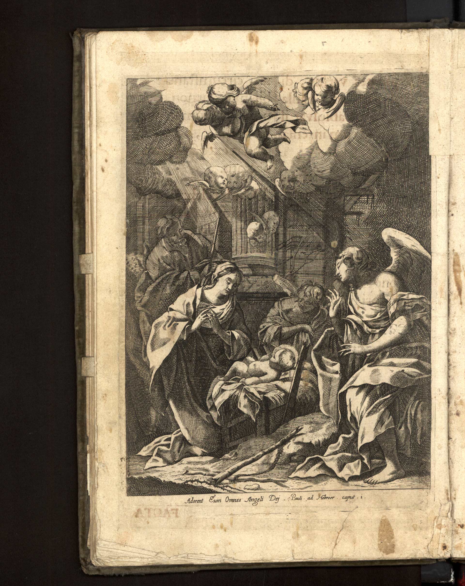 Ca-2-03) Vlastní text mešního kánonu uvozuje nesignovaná mědirytina adorace narozeného Krista.