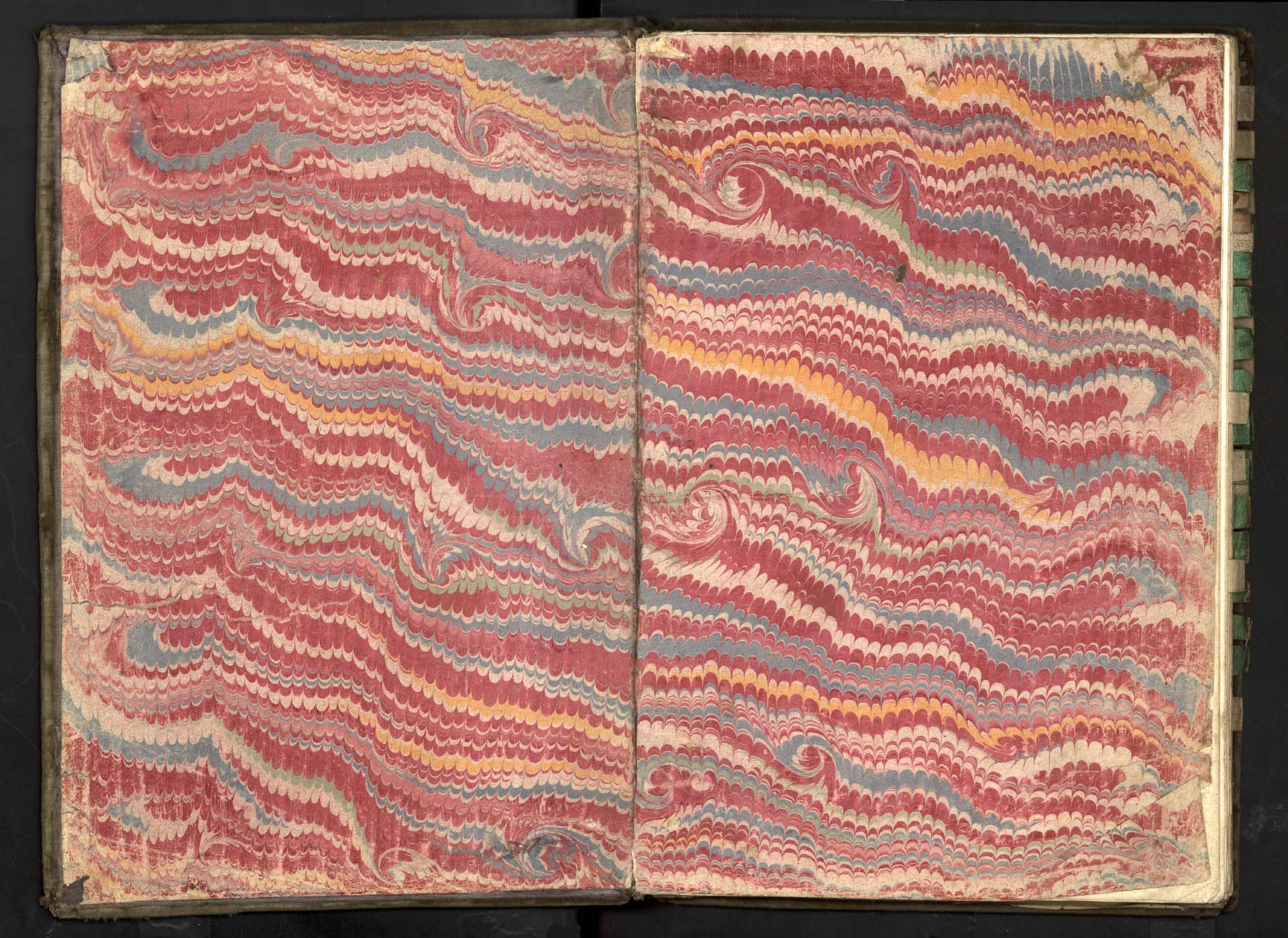 Ca-2-04) Přídeští i předsádka jsou vylepeny tureckým papírem, na pravém okraji jsou patrny záložky umožňující snadnější otáčení listů.